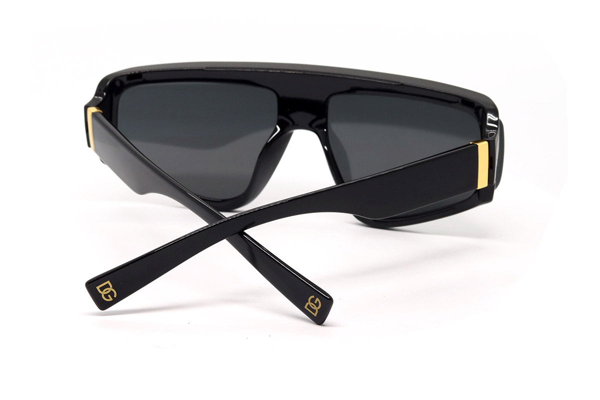 Оправа этих солнцезащитных очков изготовлена из прочного гипоаллергенного пластика. Форма оправы нестандартная: близка к прямоугольной, но углы несколько закруглены. На рамке оправы (над переносицей) есть фирменное лого — буквы DG золотистого цвета. Сверху рамки есть небольшой козырек для дополнительной защиты от солнечных лучей.- Материал оправы: пластик