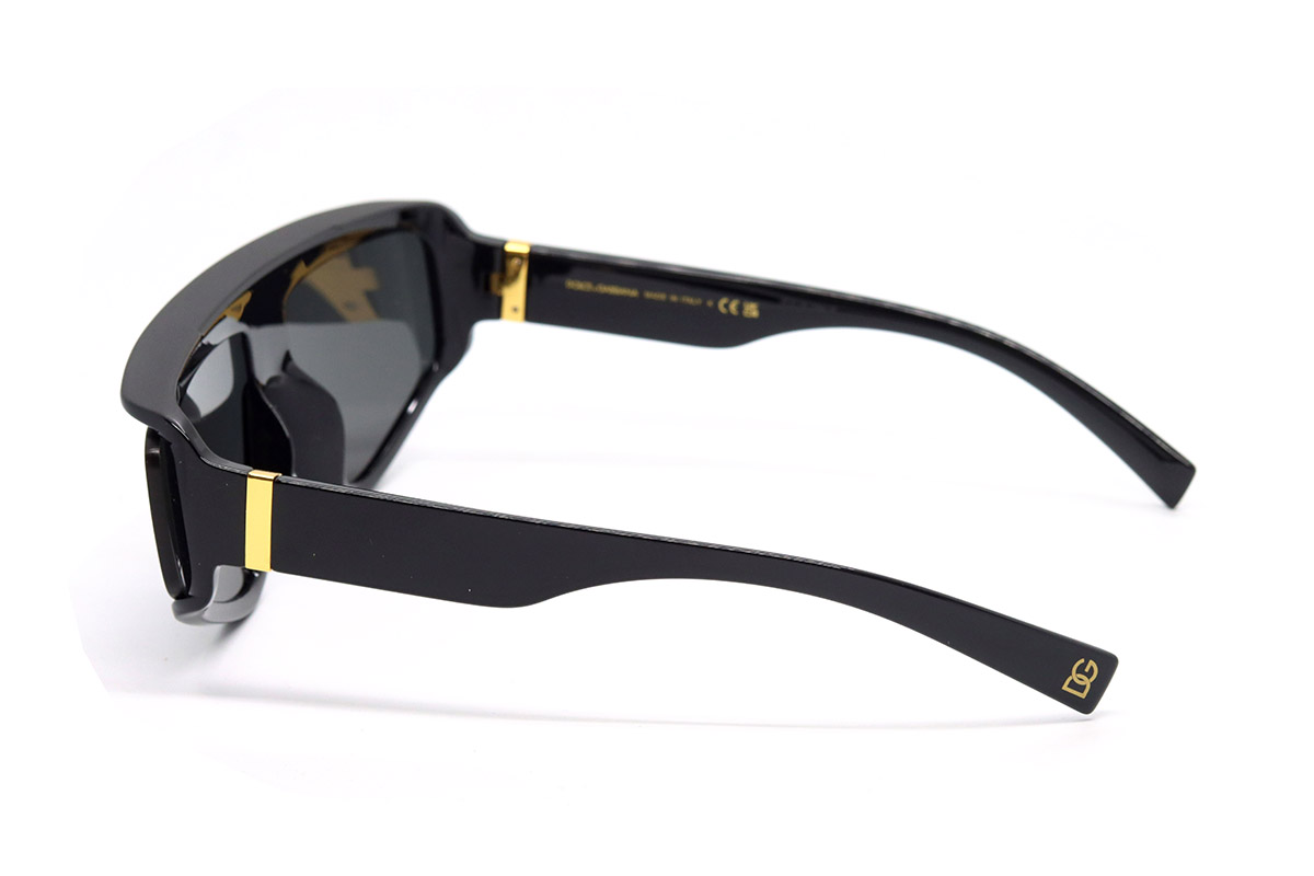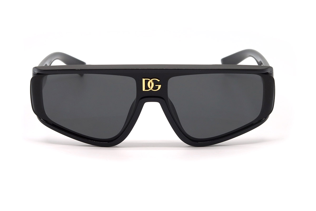 Оправа этих солнцезащитных очков изготовлена из прочного гипоаллергенного пластика. Форма оправы нестандартная: близка к прямоугольной, но углы несколько закруглены. На рамке оправы (над переносицей) есть фирменное лого — буквы DG золотистого цвета. Сверху рамки есть небольшой козырек для дополнительной защиты от солнечных лучей.- Материал оправы: пластик